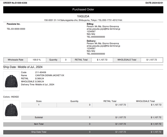 商品管理 > 対象の展示会 > [設定] > [バイヤー] > [編集] に進み、帳票の言語を「English」に設定